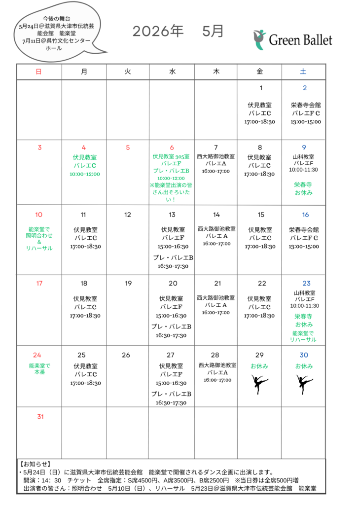 ・5月24日(日)@大津市伝統芸能会館 のチケットをご予約いただいて、お代金をお預かりしていない方のチケット引き換えは5月18日までとさせていただきます(Green Balletではチケットの管理はしてないため、本番が近づきますとこちらでは対応できません)。
